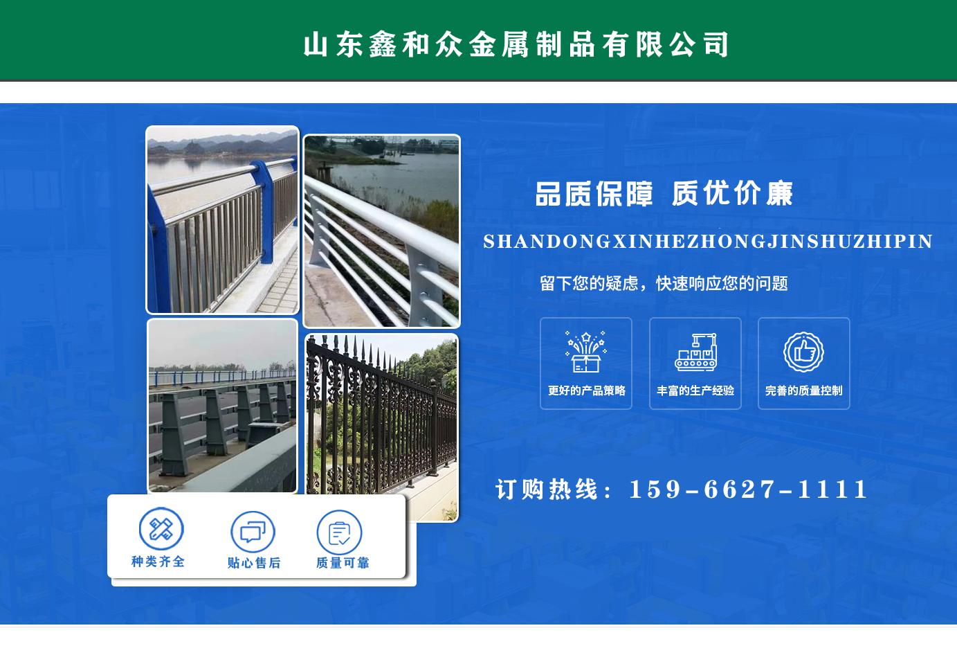 山東鑫和眾金屬制品有限公司主要產(chǎn)品有防撞護(hù)欄,橋梁護(hù)欄,道路護(hù)欄,河道護(hù)欄,不銹鋼護(hù)欄等護(hù)欄。提供設(shè)計(jì)方案,一站式定制,包您滿意價(jià)格優(yōu)惠,歡迎來(lái)電咨詢! 公司常年從事銷售護(hù)欄防撞護(hù)欄,橋梁護(hù)欄,道路護(hù)欄,河道護(hù)欄,不銹鋼護(hù)欄,橋梁鋼護(hù)欄,河道燈光護(hù)欄等。產(chǎn)品廣泛應(yīng)用于橋梁、河道、旅游景區(qū)、道路、公路、公園、小區(qū)、景觀、道路防撞等領(lǐng)域?! 」井a(chǎn)品均采用優(yōu)質(zhì)不銹鋼材料,符合相關(guān)標(biāo)準(zhǔn)。各種型號(hào)不銹鋼復(fù)合管及護(hù)欄,質(zhì)量嚴(yán)格把控。產(chǎn)品強(qiáng)度高、耐腐蝕、焊接牢固、抗沖擊、性能好,防撞護(hù)欄結(jié)構(gòu)簡(jiǎn)單、美觀實(shí)用大方。 歡迎前來(lái)訂購(gòu)!...